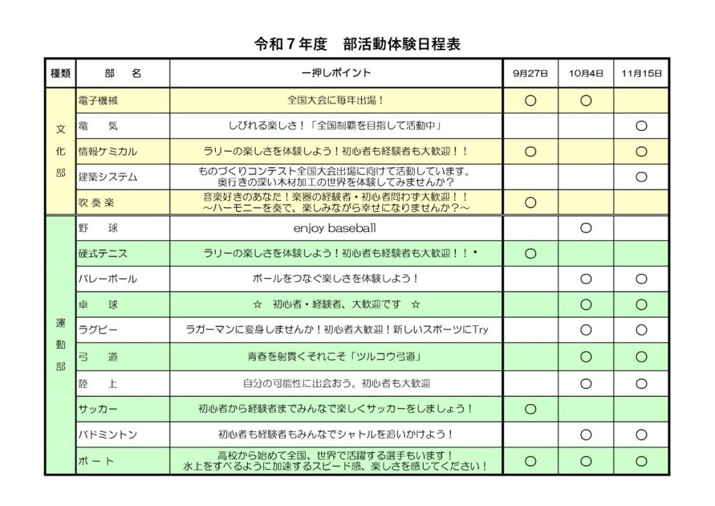 9月27日(土)の部活動体験に参加予定の皆さんは、以下の内容をご確認ください。