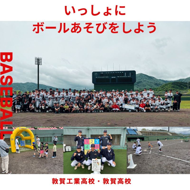 5月10日に敦賀工業高校と敦賀高校の野球部が「いっしょにボールあそびをしよう」を開催しました。小学校1,2年生を対象に野球や体を動かすことの楽しさを伝えようと企画しています。