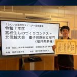 2025年2月11日 / 最終更新日時 : 2025年2月28日 Tsurukou 電気科 フューチャートップ賞受賞 11日に福井産業フェアで課題研究で制作したイルミネーションのポスターセッションがありました。 福井フューチャートップ賞の受賞式では、代表して本校3年電気科の金森さんが藤丸伸和教育長から賞状をもらいました。